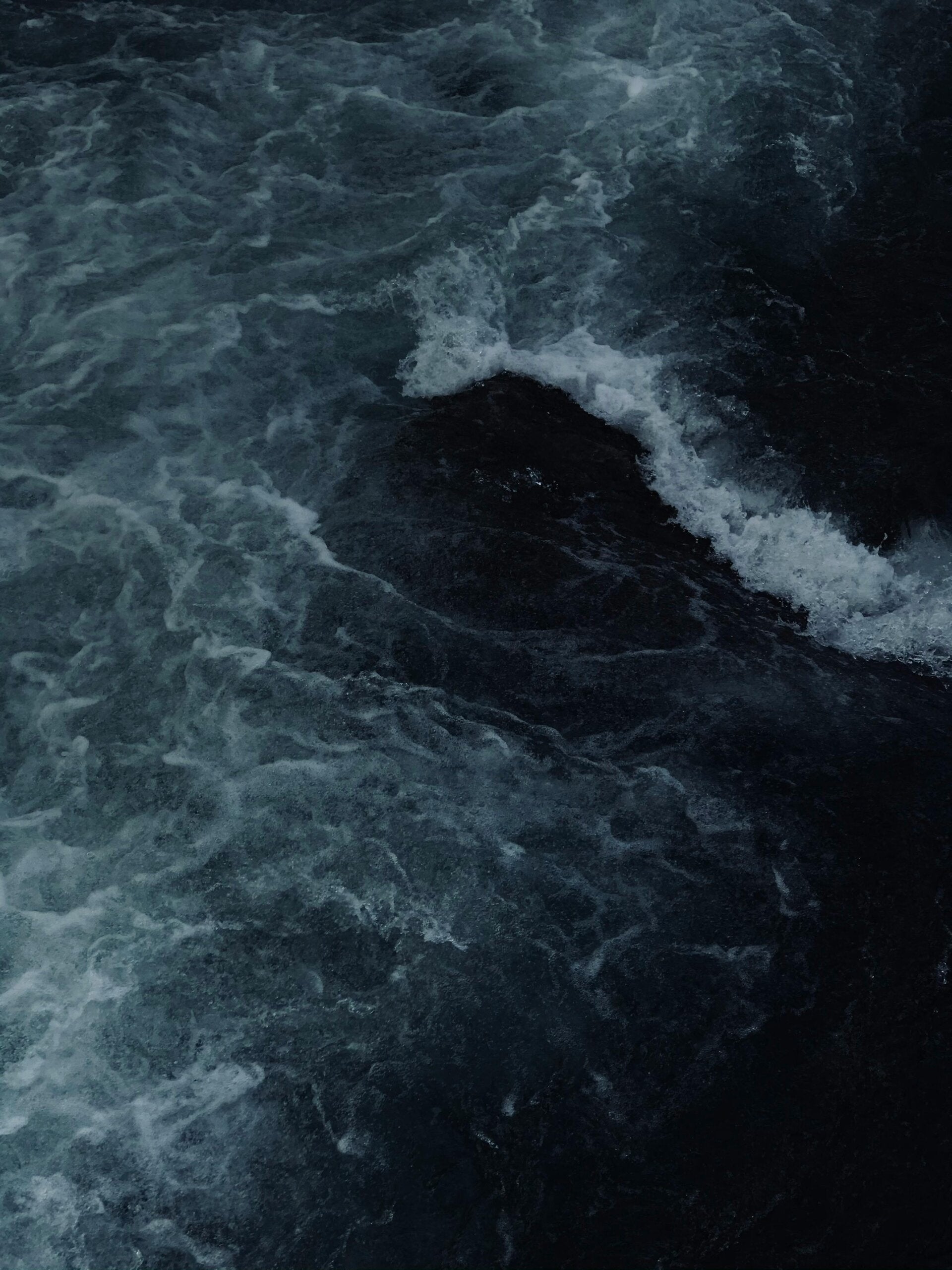 Image Description: Dark, blue-black waves whirl in a stormy ocean, capped with white foam.