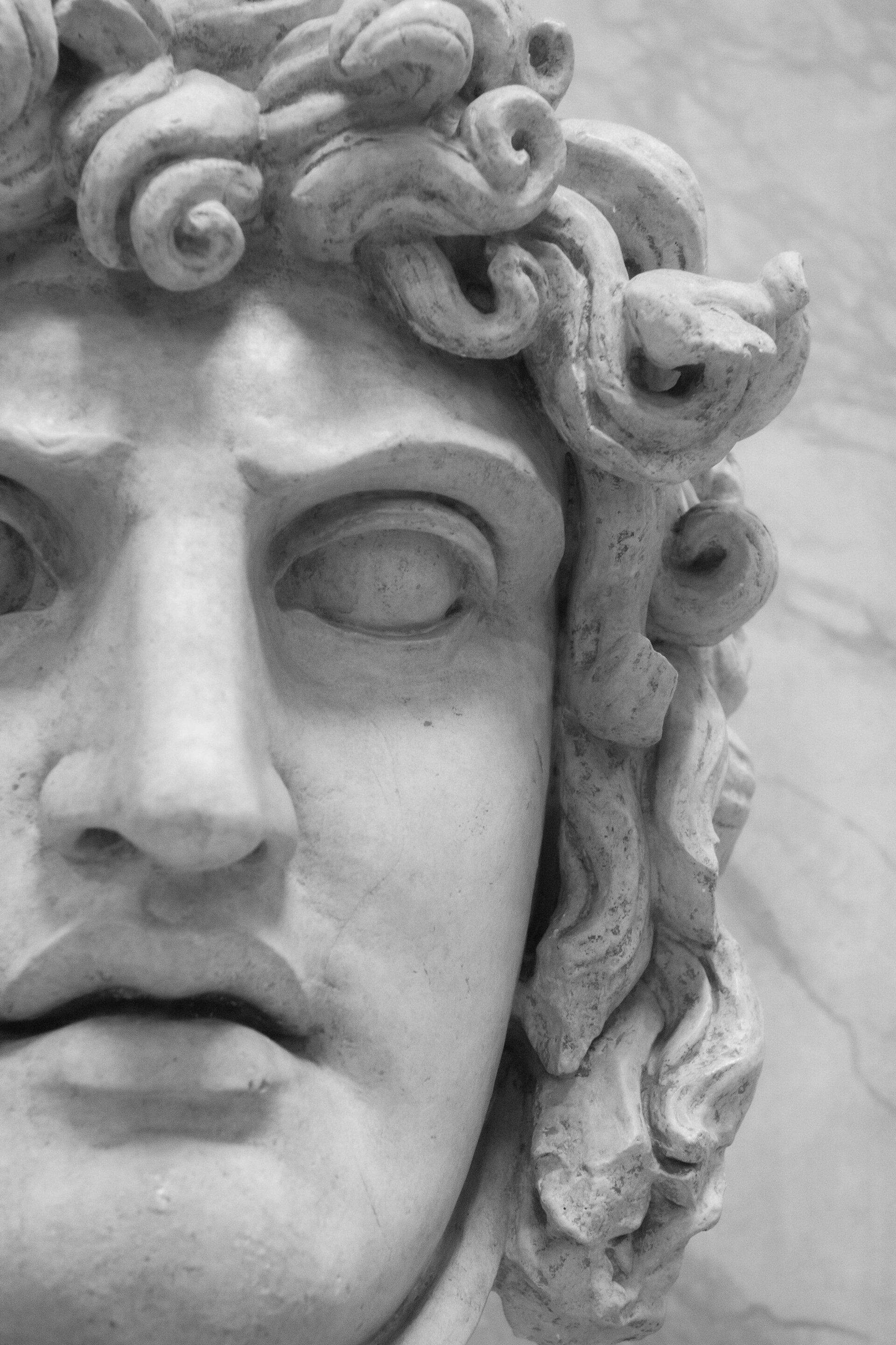 Image Description: A photo of an ancient face chiseled in stone. The face is gray with age, but the skin is still smooth with full lips, a long nose, and wide eyes. The face is framed by thick curls.