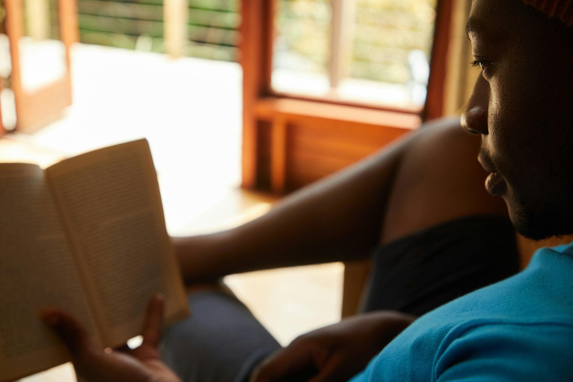 Image Description: A young Black man sits with an ankle across his knee and a pensive look on his face. He is holding a book with yellowing pages open and is reading intently.