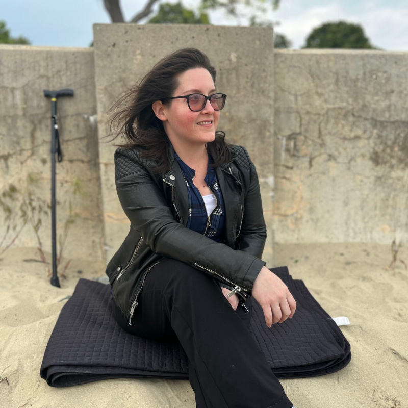 Image Description: Laura Browne-Lambert, a white woman with windblown shoulder length, dark-brown hair. She wears rose-tinted lenses with black frames. Seated on a sandy beach, she wears black dress pants, a black, leather jacket, and a blue-plaid shirt. Her black cane leans against the concrete retaining wall behind her.