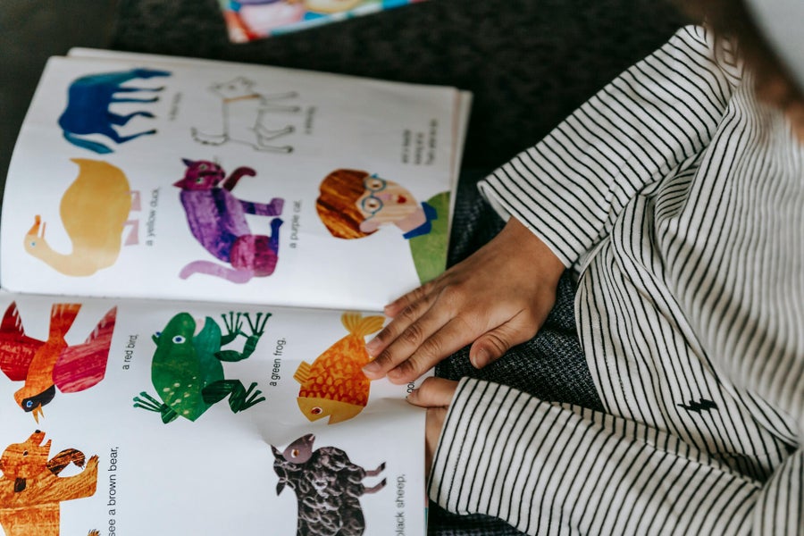 Image Description: A child is visible from the chest down. They are wearing a striped black and white shirt and are reading a picture book. The book is open to a page with colorful animals including a brown bear, a red bird, a green frog, a goldfish, a black sheep, a purple cat, and others.