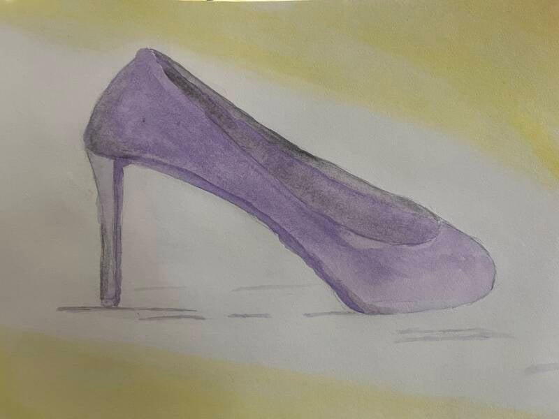 Image Description: A simple watercolor painting of a purple stiletto shoe. The backdrop is a field of yellow and white. The painting incorporates the colors of the nonbinary flag (yellow, white, purple, and black).