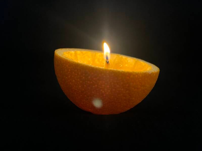 Image Description: A photo of half an orange, the flesh gutted so only the rind and a pithy stem remains. A little oil sits in the bowl of the rind and the stem is lit like a candle. The orange is centered against a black background.