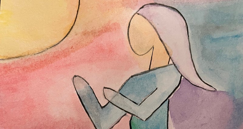 Image Description: A clip of a simple, abstract painting with a geometric sketch of a woman's head and torso. She reaches up toward the sun in the top left of the painting. Made using watercolor, shades of red, orange, blue, and purple complete the drawing.
